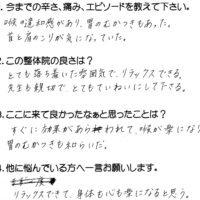 【高岡市 50代 女性】 ■ 今までの辛さ、痛み、エピソードを教えて下さい。 喉の違和感があり、胃のむかつきもあった。首と肩のこりが気になっていた。 ■ この整体院の良さは? とても落ち着いた雰囲気で、リラ …