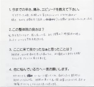 施術中、ほとんど痛みを感じることがなく、普段から自分でもできるストレッチ等アドバイスいただけることです。