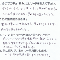 治療後は痛みも和らぎ、リラックスしていると実感できる。 治療中の会話も楽しく、日頃のストレスが発散できる。 高岡市 40代 女性