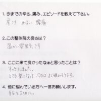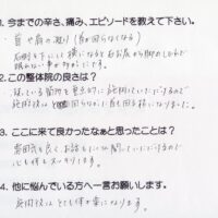 【高岡市 30代 男性】 ■ 今までの辛さ、痛み、エピソードを教えて下さい。 首こり、背中からの張りがあり、夜寝る時も寝付きが悪いことがあった。 ■ この整体院の良さは? 女性の整体師さんなので、女性の方も …