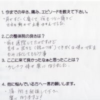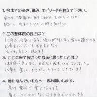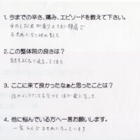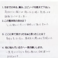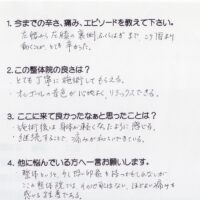 【氷見市 40代 女性】 ■ 今までの辛さ、痛み、エピソードを教えて下さい。 肩が痛くて、手が上がらない 腰が痛くて、長い間立っていたり、歩いたりがあまりできない ■ この整体院の良さは? 心地よさ 強さ加 …