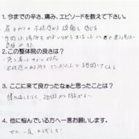 【高岡市 60代 女性】 ■ 今までの辛さ、痛み、エピソードを教えて下さい。 肩がすごく痛くて、夜もつらい痛さで自由な動きができませんでした。 ■ この整体院の良さは? 前も通院していたのですけど、先生の良 …