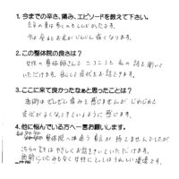 【射水市 50代 女性】 ■ 今までの辛さ、痛み、エピソードを教えて下さい。 去年の夏は歩くのもしんどかったです。今は座るとお尻がじんじん痛くなります。 ■ この整体院の良さは? 女性の整体師さんで、ニコニコと私の話を聞 …