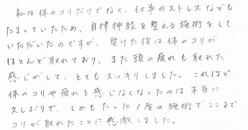 私は体のコリだけでなく、仕事のストレスなどもたまっていたため、 自律神経を整える施術をしていただきました。 たった1度の施術で、体のコリがほとんど取れており、頭の疲れも取れた感じがして、 とてもスッキリしました。 高岡市 30代 女性