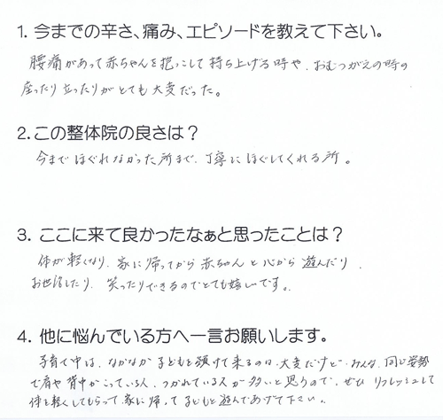 腰痛があり、赤ちゃんを抱っこして持ちあげるときや、 おむつがえの時の座ったり立ったりがとても大変でした。 施術後は体が軽くなり、家に帰ってから赤ちゃんと心から遊んだりお世話したり 笑ったりできるのでとてもうれしいです。 子育て中は体が疲れている人が多いので、ぜひリフレッシュして体を軽くしてもらい、 家で子どもと遊んであげてください。 高岡市 30代 女性