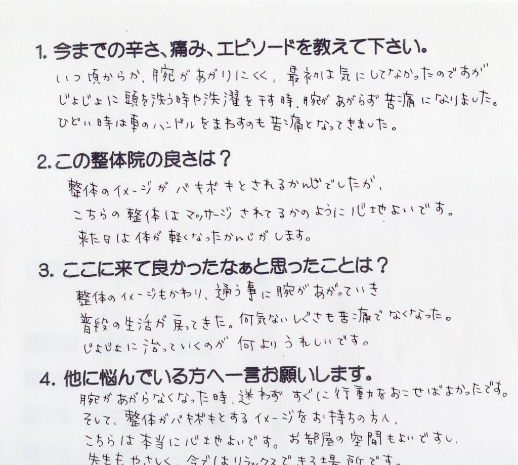 いつ頃からか腕が上がりにくく、最初は気にしてなかったのですが、徐々に頭を洗う時や洗濯を干す時、腕が上がらず苦痛になりました。