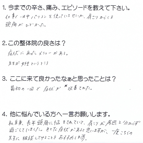 長年頭痛に悩まされていて、肩こりが原因と分かっていませんでした。 最初の一回で頭痛が改善されました。 先生が女性というのもいいと思います。 K・T 高岡市 20代 女性