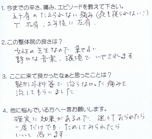 夜も寝られないくらいの痛み、整形外科でも治らなかった痛みを 治してもらいました。 確実に効果があるので、ためしてみられたらいいと思います。