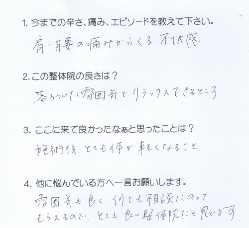 肩、腰の痛みが施術後にとても体が軽くなる。 雰囲気も良く何でも相談にのってもらえるので、 とても良い整体院だと思います。