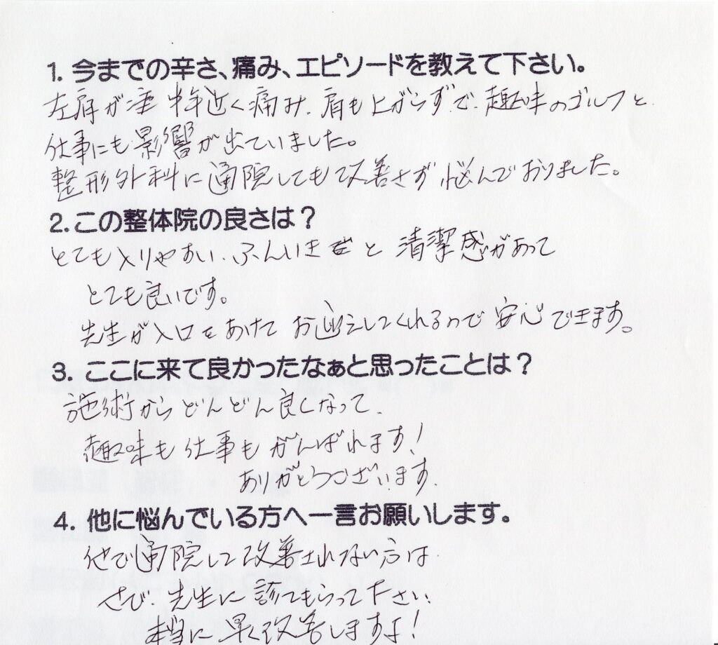 左肩が半年近く痛み、肩も上がらずで、趣味のゴルフと仕事にも影響が出ていました。整形外科に通院しても改善せず悩んでおりました。