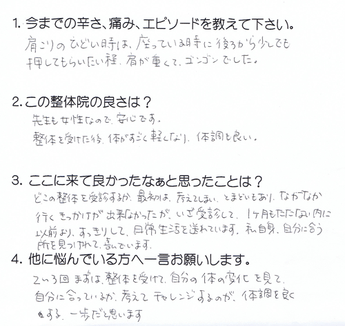 どこの整体を受診するか、最初は戸惑いもあり、行くきっかけができなかったが、 いざ受診して、1か月もたたない内に以前よりすっきりして、 日常生活を送れるようになりました。 2~3回まずは整体を受けて、自分の体の変化を見てみるといいと思います。 S・S 高岡市 40代 女性