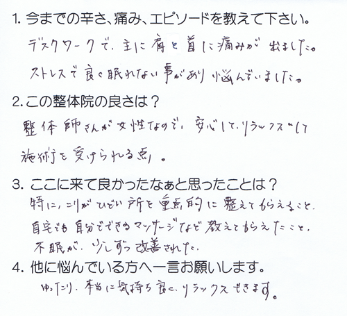 ストレスでよく眠れないことがあり悩んでいました。 こりがひどい所を重点的に整えてもらえると、 不眠が少しずつ改善されました。