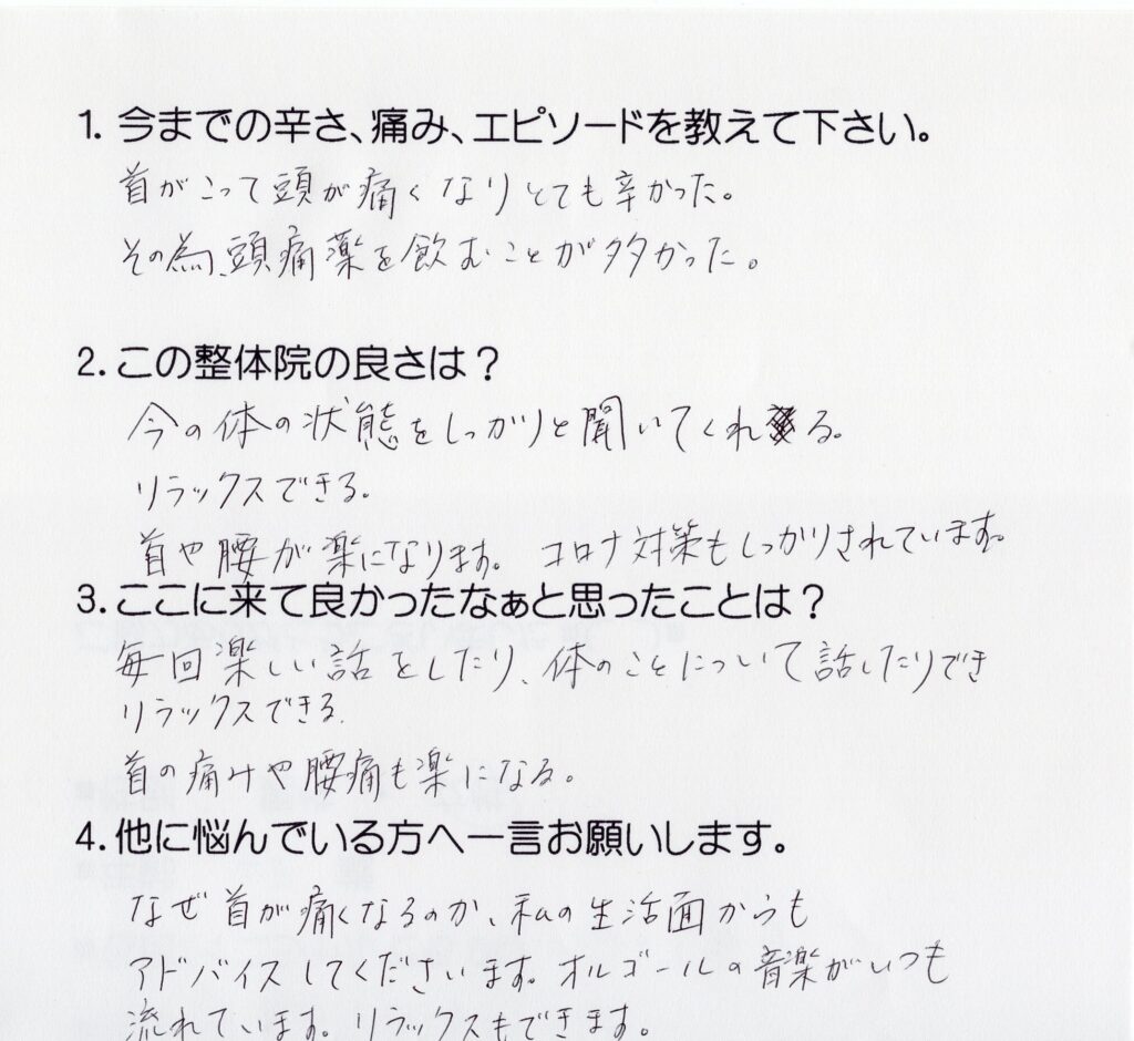なぜ首が痛くなるのか、私の生活面からもアドバイスしてくださいます。