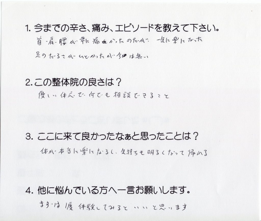 首、肩、腰が常に痛かったが、一気に楽になった。