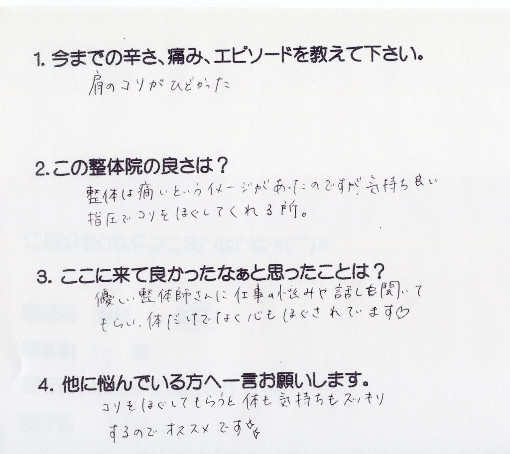 整体は痛いというイメージがあったのですが、気持ちよい指圧で凝りをほぐしてくれる所。