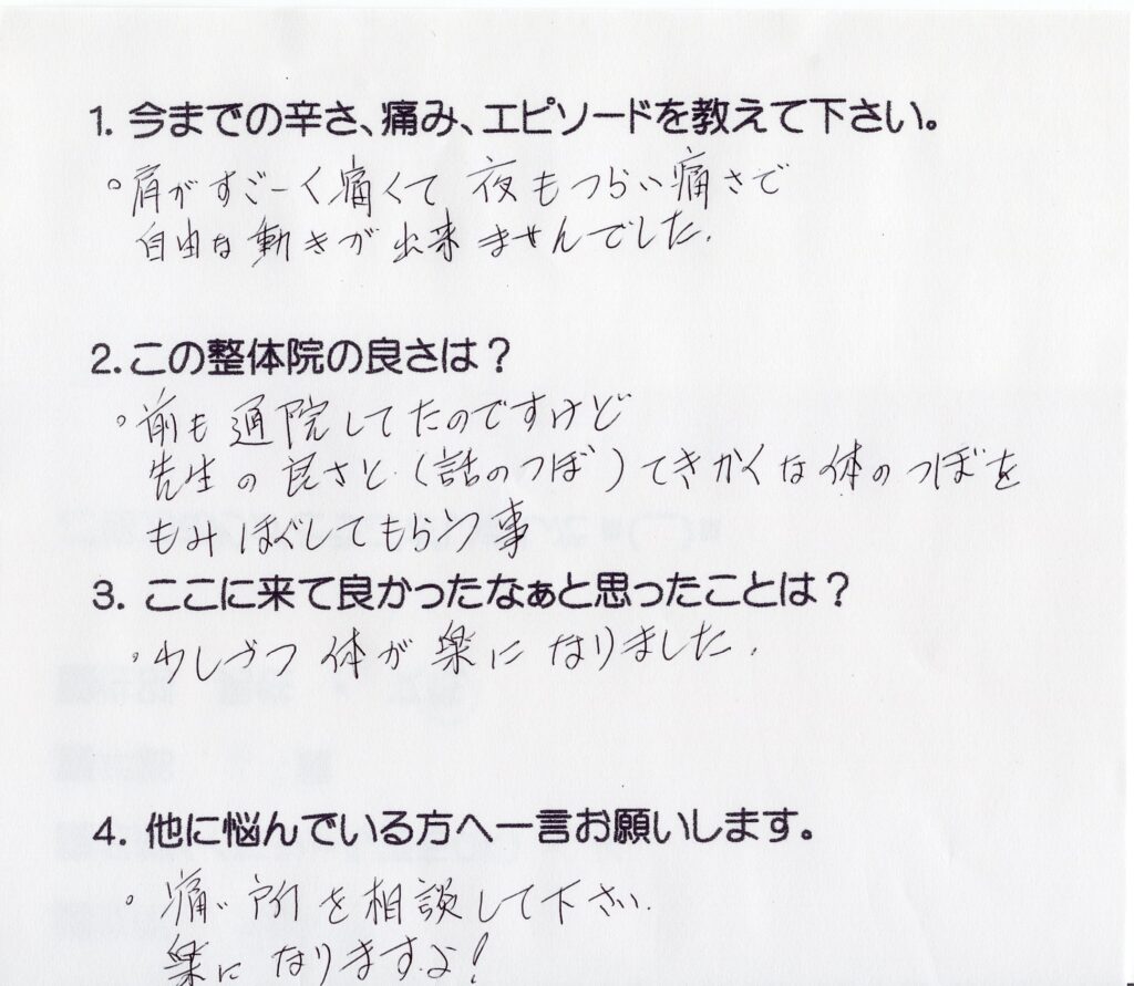 肩がすごく痛くて、夜もつらい痛さで自由な動きができませんでした。