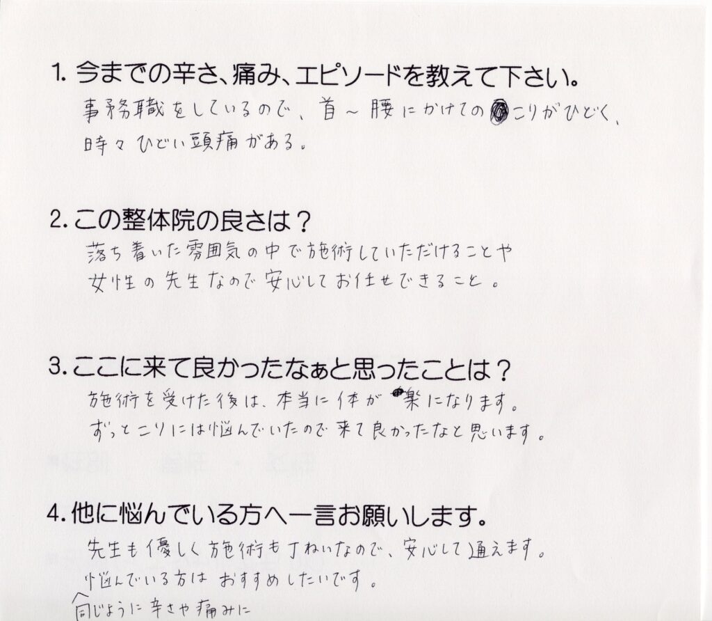 事務職をしているので、首~腰にかけてのこりがひどく、時々ひどい頭痛がある。