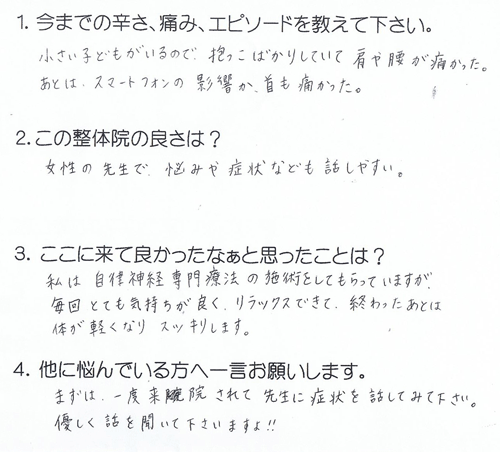 小さい子どもの抱っこで肩や腰が痛く、スマートフォンの影響か首も痛かった。 私は、自律神経専門療法の施術をしてもらっていますが、とても気持ちが良く、 終わったあとは体が軽くなりスッキリします。 高岡市 33歳 女性