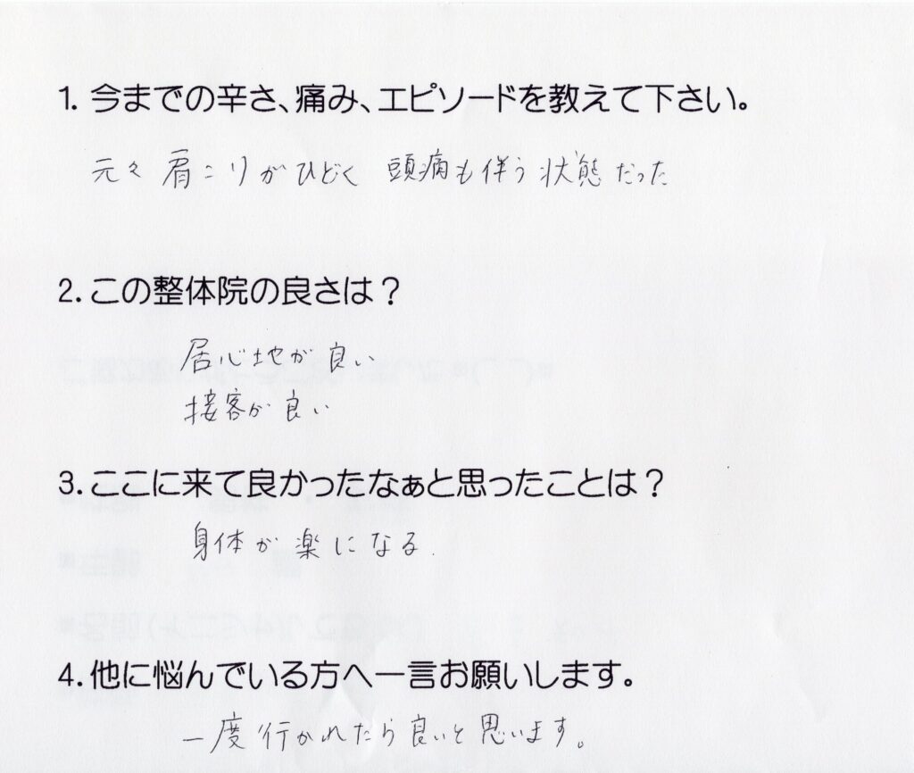 元々肩こりがひどく、頭痛も伴う状態だった。