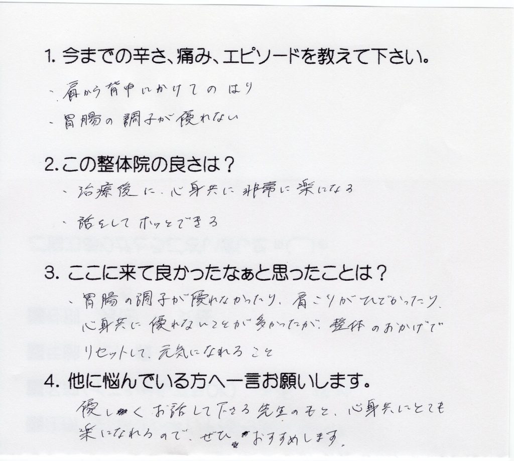 胃腸の調子が優れなかったり、肩こりが酷かったり、心身ともに優れないことが多かったが、整体のおかげでリセットして、