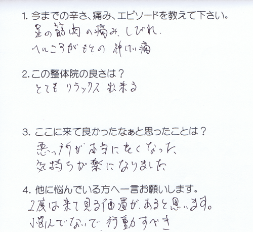 ヘルニアがもとの神経痛だったが、 悪いところが本当によくなった。 気持ちが楽になりました。 2度は来てみる価値があると思います。
