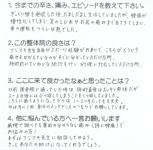 ぎっくり腰を発症した後、だましだまし生活していましたが、腰痛が慢性化してしまい、 足のしびれやお尻の痛みまででてきて車の運転もつらい状態でした。 以前は接骨院に通っていましたが、施術直後はスッキリしますが2~3日後にはぶり返してしまいました。 こちらに通ってからは1~2カ月たっても大丈夫。今は、月に1回、体のメンテナンスをお願いしています。 射水市 40代 男性
