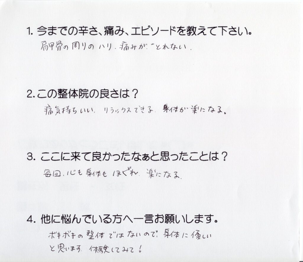 ボキボキの整体ではないので、身体に優しいと思います。体験してみて!