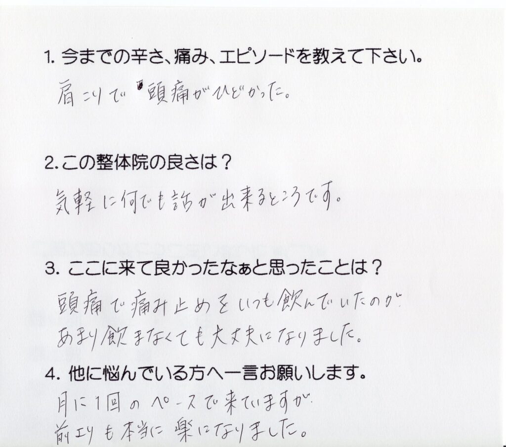 頭痛で痛み止めをいつも飲んでいたのが、あまり飲まなくても大丈夫になりました。