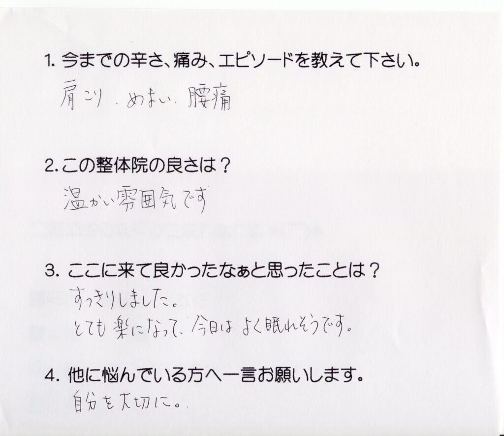 スッキリしました。とても楽になって、今日はよく眠れそうです。