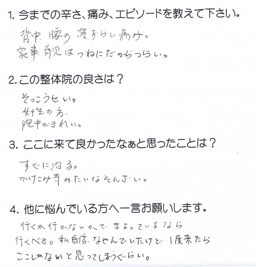背中と腰が痛くて寝るのがつらいほどでした。 家事と育児は毎日なので、とてもつらかったです。 ここに来るとすぐに治るし、駆け込み寺のような存在です。 K・J 高岡市 30代 女性