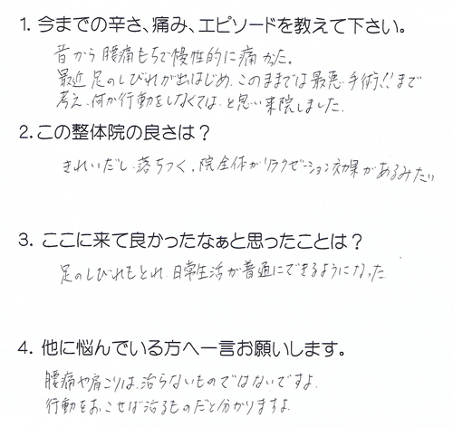 昔から腰痛もちで、慢性的に痛かった。最近、足のしびれも出はじめ、 このままでは手術!まで考え、何か行動しなくてはと思い来院しました。 施術後、足のしびれがとれ、日常生活が普通にできるようになった。 腰痛や肩こりは、行動を起こせば治るものだとわかりますよ。 T・Y 高岡市 40代 女性