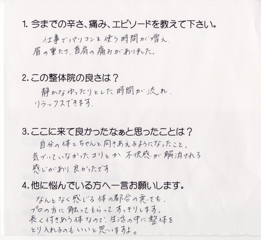 仕事でパソコンを使う時間が増え、眉の重たさ、首肩の痛みがありました。