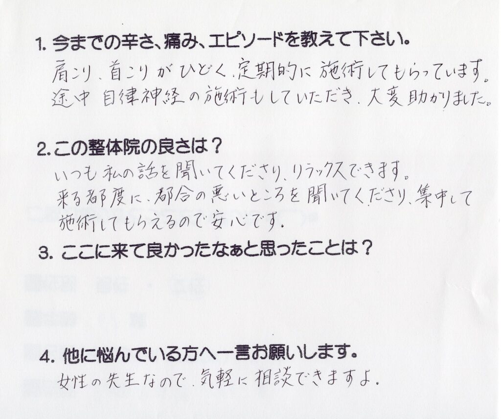 肩こり、首凝りひどく、定期的に施術してもらっています。