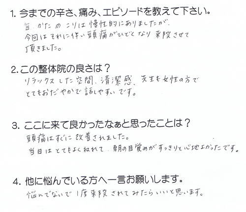 来院したら頭痛がすぐに改善されました。 当日はとてもよく寝れて、朝の目覚めがすっきりと心地よかったです。 院内はリラックスした空間、清潔感があり、 先生も女性の方でとてもおだやかで話しやすいです。 N・Y 砺波市 30代 女性