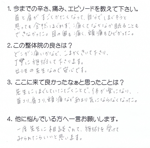 女性の先生なので安心なんと、どこが痛いかなど、こまかく聞いてくださり、 丁寧に施術をしてくださいます。首こり、頭痛など、あまり気にならなくなりました。 T・K 氷見市 30代 女性