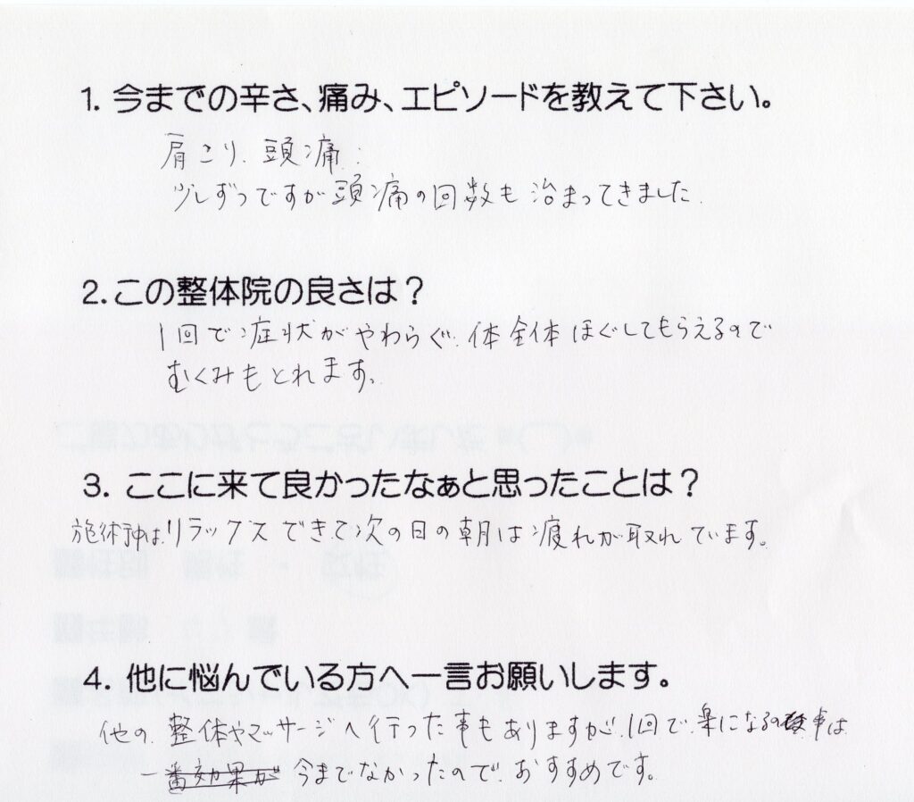 他の整体院やマッサージへ行ったこともありますが、1回で楽になることは今までなかったので、おすすめです。