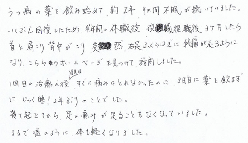 うつ病の薬を飲み始めて約2年、その間、不眠が続いていました。 1回目の治療の後、当日はすぐに痛みはとれなかったのに、 3日目には薬を飲まずに熟睡!2年ぶりのことでした。 まるで嘘のように、体も軽くなりました。 高岡市 40代 女性