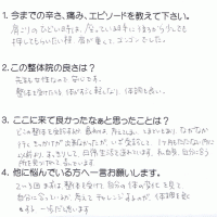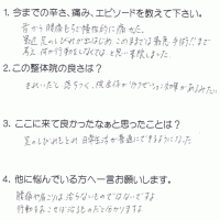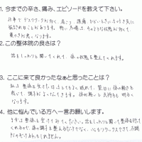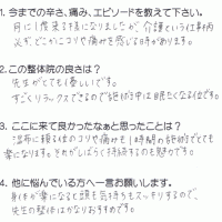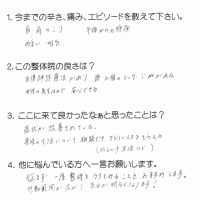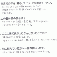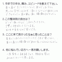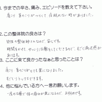 肩から首、頭にかけてすっきりせず、薬を処方してもらっていました。 それを避けたくて施術を受けました。体が軽く、スッキリした気分になれました。 整体で体をケアしてあげた方が良いかなと思いました。 K・Y 高岡 …