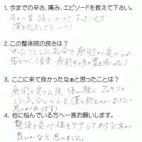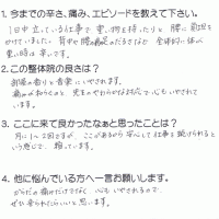 1日中立っている仕事で、重い物を持ったりと、腰に負担をかけていました。 痛みが和らぐのと、先生のやわらかな対応で心も癒されています。 Y・W 小矢部市 40代 女性
