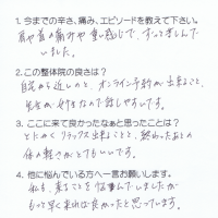 私は体のコリだけでなく、仕事のストレスなどもたまっていたため、 自律神経を整える施術をしていただきました。 たった1度の施術で、体のコリがほとんど取れており、頭の疲れも取れた感じがして、 とてもスッキリしま …